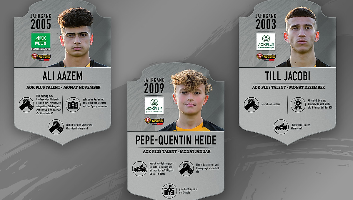 Jan Seifert, Nachwuchsleiter der SG Dynamo Dresden, sagt: „Das gemeinsame Projekt mit der AOK PLUS ist hervorragend gestartet und bietet sowohl Aufmerksamkeit als auch Wertschätzung für unseren SGD-Nachwuchs. Ganz bewusst ehren wir die jungen Spieler nicht nur für ihre Leistung auf dem Rasen, sondern auch für ihr Verhalten abseits des Platzes. Als Ausbildungsverein ist es unsere Aufgabe, Talente nachhaltig zu fördern und immer wieder neue Anreize für ihre positive Entwicklung zu schaffen. Ali Aazem, Till Jacobi und Pepe-Quentin Heide haben sich innerhalb ihrer Teams nicht nur als sportliche, sondern auch als menschliche Führungsspieler hervorgetan. Sie haben sich die Anerkennung als ‚Nachwuchsspieler des Monats‘ absolut verdient.“