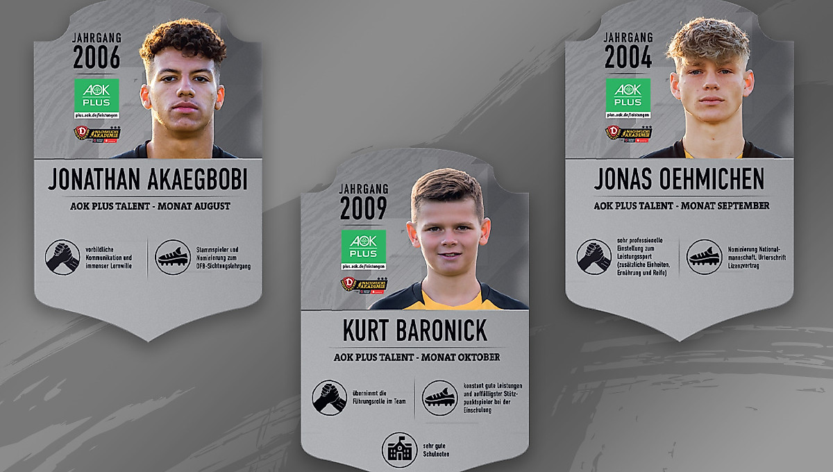 Jan Seifert, Nachwuchsleiter der SG Dynamo Dresden, sagt: „Bereits im SGD-Leitbild steht: ‚Wir sind ein Ausbildungsverein!‘. Mit unserer engagierten Nachwuchsarbeit möchten wir auch in Zukunft regelmäßig Spitzentalente ausbilden, die den Sprung in unsere Profimannschaft packen und für besondere Momente im schwarz-gelben Trikot sorgen. Dazu gehört, dass wir die Jungs nicht nur in ihrer fußballerischen und persönlichen Weiterentwicklung eng begleiten, sondern permanent auf unsere Nachwuchsarbeit aufmerksam machen. Mit der Auszeichnung zum ‚AOK PLUS Nachwuchsspieler des Monats‘ gelingt es uns, besondere Leistungen – sowohl auf als auch neben dem Rasen – zu würdigen und über alle Jahrgänge hinweg einen weiteren Anreiz zu schaffen, sich individuell und mannschaftlich maximal einzubringen. Jonathan Akaegbobi, Jonas Oehmichen und Kurt Baronick haben in den vergangenen Monaten eine hervorragende Entwicklung genommen, sie sind ideale Vertreter für die ersten Nachwuchs-Monatsauszeichnungen in der Geschichte der SGD.“
