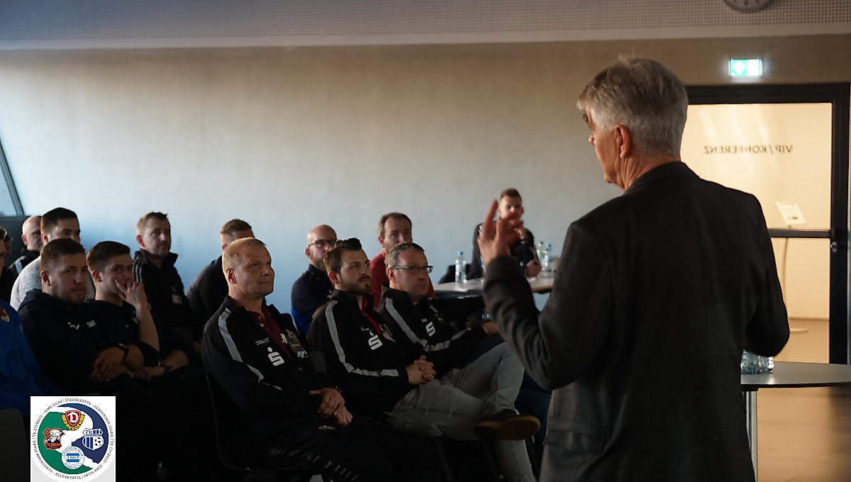 Zielgruppe waren Trainer aus dem Grundlagen- und Aufbaubereich, 63 Übungsleiter aus 25 Vereinen nahmen an der Fortbildung im VIP-Raum von Dynamos Nachwuchspartner „BallsportArena Dresden“ teil.