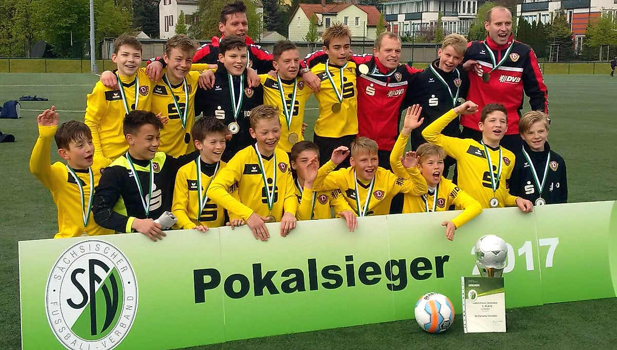Grund zum Feiern hatte am Samstag Dynamos U13-Mannschaft. In der Endrunde um den Sachsenpokal 2016/17 setzte sich die Mannschaft von Trainer Martin Wehner durch und durfte nach einem spannenden Finale gegen Rasenballsport Leipzig den Pott in die Höhe heben.