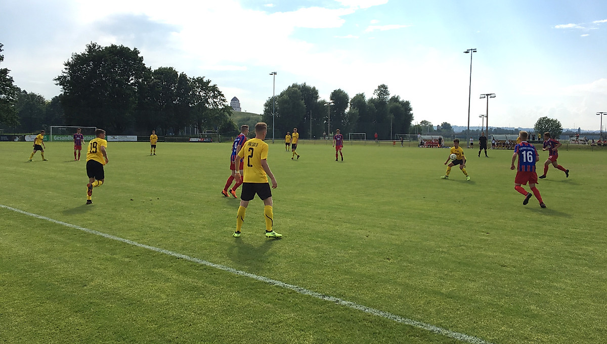 Dynamos U16-Mannschaft hat sich im Nachholspiel der B-Junioren-Regionalliga Nordost gegen die U16-Vertretung von Energie Cottbus am Mittwochnachmittag 4:1 (1:1) durchgesetzt. Damit verkürzte das Team von Trainer Tino Gaunitz den Abstand auf die Nichtabstiegszone bei zwei ausstehenden Partien auf zwei Punkte.Bei drückend heißen Temperaturen ließ die SGD im ersten Durchgang so gut wie nichts anbrennen und ging nach einer halben Stunde in Führung. Jonas Jiranek setzte sich rechts außen durch und passte flach ins Zentrum, am zweiten Pfosten war Nick Hünig zur Stelle und verwandelte an mehreren Gegnern vorbei halbhoch ins lange Eck.