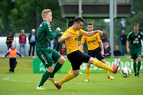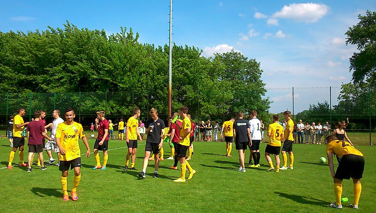 Eine Klasse-Saison geht für Dynamos U17-Junioren in die Verlängerung. In zwei Aufstiegsspielen um einen Startplatz in der B-Junioren-Bundesliga trifft die Gaunitz-Elf auf den VfB Lübeck (Regionalliga Nord). Die Weichen stellten die Schwarz-Gelben am Sonntag mit einem hart erarbeiteten 1:0-Auswärtssieg beim FC Energie Cottbus II. Weil zeitgleich Rostock bei Hertha BSC II nur 1:1 spielte, sicherte sich Dynamo noch Tabellenplatz Zwei, der zu den Qualifikationsspielen berechtigt.Bei einer Hitzeschlacht in der Oberlausitz erwiesen sich die Cottbusser als ebenso starker Gegner wie im Hinspiel (SGD-FCE 2:1), der den Dresdnern bis zur letzten Minute alles abverlangte. Die Gastgeber waren über weite Strecken das leicht dominante Team, Dynamo hatte vor allem im ersten Durchgang immer wieder Schwierigkeiten im Spiel gegen den Ball. Nach einer Umstellung zur Pause lief es bei Schwarz-Gelb dann besser. Das wichtige Tor fiel nach einem sehr gut vorgetragenen Angriff, den Justin Leonhard Löwe zunächst mit einem Distanzschuss abschloss. Der Energie-Schlussmann ließ die Kugel prallen, Kevin Urbanek und Marcel Hänsel lauerten auf den zweiten Ball, Letzterer drückte die Kugel schließlich zur 1:0-Führung über die Linie (60.).