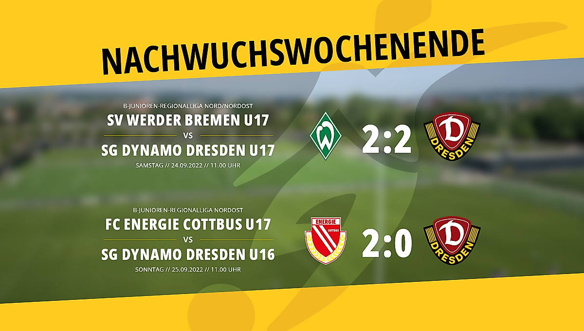 Am vergangenen Nachwuchswochenende gelang der U17 der Sportgemeinschaft auswärts beim SV Werder Bremen durch ein 2:2-Unentschieden ein Punktgewinn. Die U16 war am 5. Spieltag der B-Junioren-Regionalliga Nordost zu Gast beim FC Energie Cottbus. Trotz guter Leistung unterlag der schwarz-gelbe Nachwuchs den Gastgebern mit 0:2.