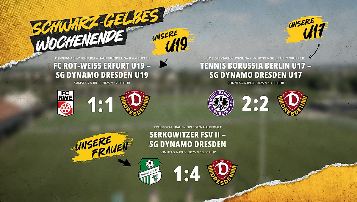 Am vergangenen Wochenende waren unsere Frauenmannschaft, sowie die U19 und U17 der Sportgemeinschaft wieder gefordert. Während die Nachwuchskicker jeweils einen Punkt holen konnten, konnte bei den Dynamo-Frauen der Einzug ins Pokalfinale gefeiert werden.
