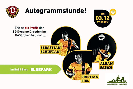 Am Mittwoch, dem 12.12.2012, könnt ihr die Dynamo-Profis Robert Koch und Mickael Poté hautnah erleben. Unser Mannschaftskapitän und unser etatmäßiger Stürmer kommen in der Woche zwischen den beiden letzten Spielen im Kalenderjahr 2012 zu einer Autogrammstunde in die Centrum Galerie. Zwischen 18 und 19 Uhr erfüllen beide Spieler im BASE Shop im Untergeschoss eure Autogrammwünsche.