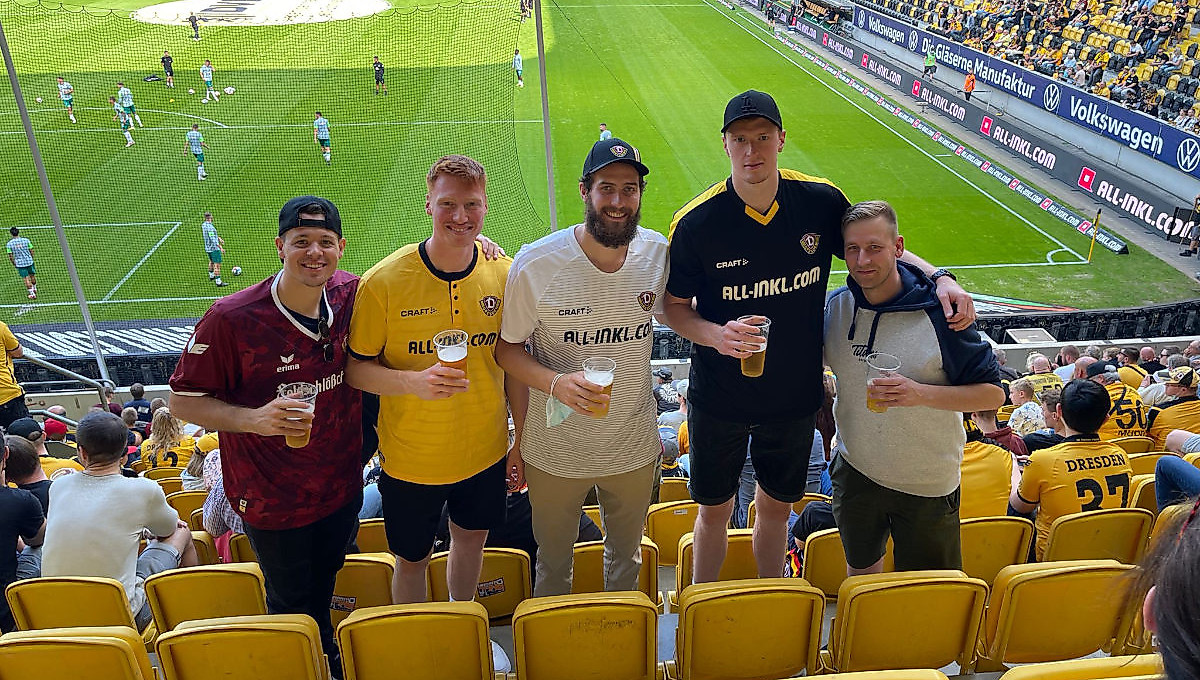 Grant Teichmann, Julius Stahl, Tanner Graham, Rico Gottwald (Geschäftsführer) und Georg Voigtmann waren beim stimmungsvollen Heimsieg gegen den Bundesliga-Absteiger vor Ort dabei. Besonders für Letzteren war der Nachmittag dabei ein ganz besonderes Erlebnis, ist er doch wie sein Bruder Johannes, der mit ZSKA Moskau in der Europa League antritt und deutscher Nationalspieler ist, seit Kindestagen glühender Dynamo-Fan.