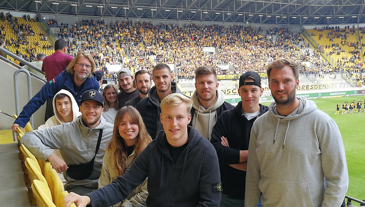 Der Dresdner Sport hält zusammen: Und so unterstützte ein Teil der Eishockey-Mannschaft von den Dresdner Eislöwen die Dynamo-Profis am Sonntag beim Heimspiel gegen den SC Paderborn im Rudolf-Harbig-Stadion.Die Eislöwen rund um die Spieler Jordan Knackstedt, Jussi Petersen, Matej Mrazek, Tom Knobloch, Leon Fern, Janick Schwendener, Moritz Israel, Maximilian Kolb, Johan Porsberger, David Rundqvist und Mannschaftsbetreuer Lennart Halling nutzten die Partie, teilweise auch in Begleitung ihrer Freundinnen, für einen gemeinsamen Teamausflug.