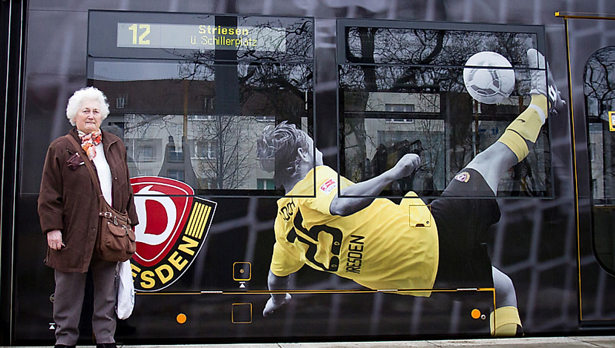 Auf den Dresdner Straßenbahnschienen fährt ab sofort ein neuer Hingucker für alle Fans der SG Dynamo Dresden. In der vergangenen Woche bekam die Dynamo-Straßenbahn, die erstmals 2009 komplett mit einem Dynamo-Design gestaltet wurde, im Betriebshof Gorbitz ein neues und zeitgemäßes Outfit verpasst. Innerhalb nur eines Arbeitstages brachte der Dynamo-Partner East|print auf der gesamten Fahrzeuglänge von 30 Metern mehr als 160 Quadratmeter Folie an.