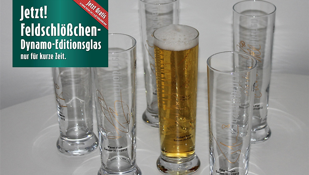 Ab sofort gibt es wieder in ausgewählten Getränkemärkten zu jedem gekauften Kasten Feldschlößchen (20x 0,5l) je eins von sechs Dynamo-Editionsgläsern gratis dazu.