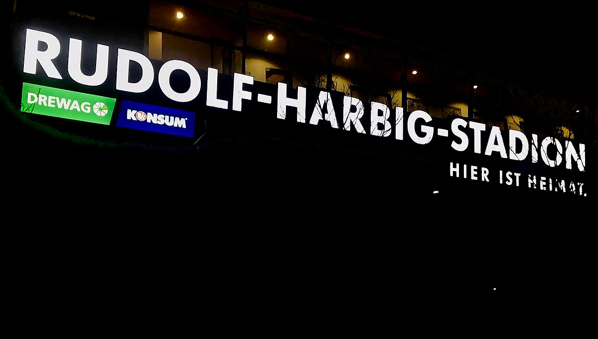 Der historische Namenszug „Rudolf-Harbig-Stadion“ leuchtet bereits seit Anfang Dezember wieder an der Lennéstraße 12. Am Samstagabend sind nun auch die letzten Arbeiten an der Glasfassade von Dynamos Heimspielstätte mit der Installation der Logos von KONSUM DRESDEN und DREWAG sowie dem Claim „Hier ist Heimat“ vollendet worden.„Eine außergewöhnliche Idee von allen Beteiligten, die nun Wirklichkeit geworden ist. Das Ergebnis kann sich sehen lassen und wir freuen uns sehr, dass der neue Schriftzug nun endlich vollständig mit den Sponsorenlogos der Namensgeber KONSUM und DREWAG am Rudolf-Harbig-Stadion leuchtet“, erklärte Dynamos kaufmännischer Geschäftsführer Michael Born.