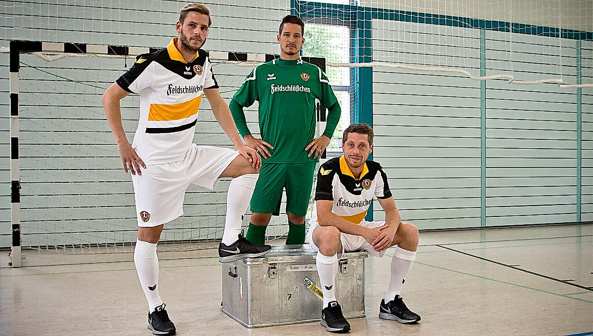 {media-right}Das schwarz-weiß-gelbe Trikot hat das Zeug zum echten Kult-Stück. Es wurde von ERIMA exklusiv für die SGD angefertigt. Wie zu Bundesliga-Zeiten in den 90er Jahren tragen die Spieler den Schriftzug „Dresden“ über der Rückennummer. Die Vorderseite mit dem dynamischen Streifen in Schwarz, Weiß und Gelb und dem gestickten Wappen der Sportgemeinschaft ist unverwechselbar.