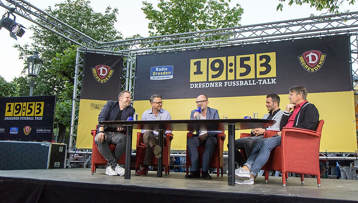 Unterhaltsame Runde im Dresdner SchillerGarten. Zur letzten Ausgabe von „19:53 – Der Dresdner Fußballtalk“ vor der Sommerpause empfing Moderator Jens Umbreit Dynamos Interims-Sportgeschäftsführer und Chefscout Kristian Walter, Hans-Jürgen „Dixie“ Dörner, Sky-Kommentator Wolff-Christoph Fuss und Zweitliga-Experte Christian Beeck.Mit seiner bekannten Stimme und markigen Sprüchen begeisterte Wolff-Christopf Fuss die rund 250 Zuschauer im SchillerGarten und sprach dabei auch über seinen letzten Besuch in Dresden: „Ich war zuletzt zum DFB-Pokal-Spiel gegen den FC Schalke im Stadion. Es war ein Fest! Davon kann sich mancher Erstligist eine Scheibe abschneiden.“