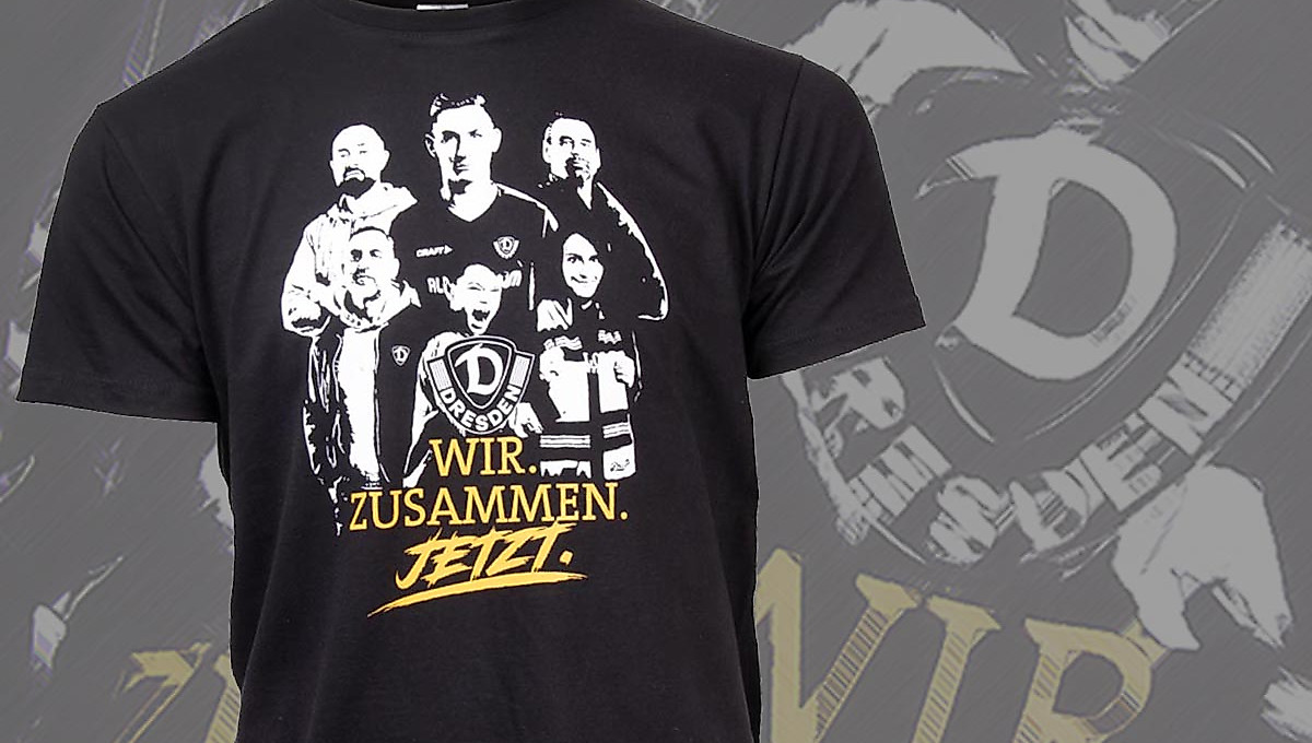 Im Rahmen der Aktion „Wir. Zusammen. Jetzt.“, mit der die SGD gemeinsam mit Vertretern der aktiven Fanszene und Vereinsmitgliedern vor dem Restrückrundenstart gegen den KSC zur Aufholjagd bläst, bringt der Dynamo-Fanshop ein passendes Motto-Shirt heraus.Während das Motiv der Kampagne in Weiß den Brustbereich des schwarzen T-Shirts ziert, ist der Schriftzug „Wir. Zusammen. Jetzt.“ im Dynamo-Gelb gehalten.