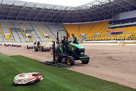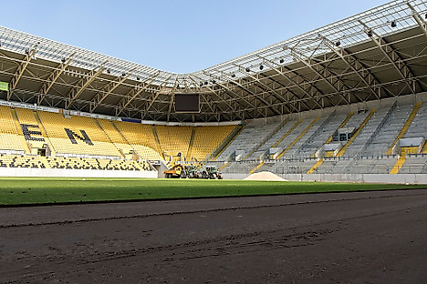 Zuerst fräsen die fleißigen Arbeiter die 3,5 Zentimeter dicke Rasen-Schicht, die sogenannte Sode, ab. Rund 500 Tonnen abzutransportierende Masse dabei. Anschließend wird die darunter liegende Rasentragschicht gelockert.