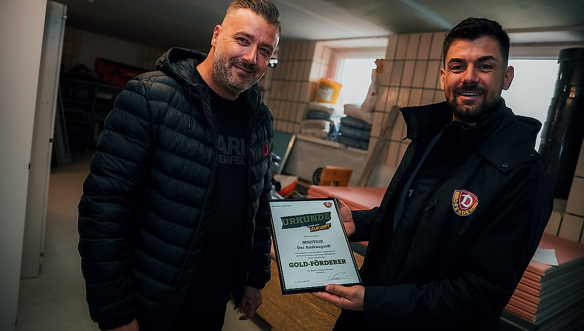 Das Auto erreicht das 100-Seelenörtchen Lehndorf und biegt auf eine kleine Plattenstraße ein. Diesmal stimmt die Zieleingabe, denn hier befindet sich das Lager von Ronny Mikitiuks Trockenbauunternehmen. Der Geschäftsinhaber führt in ein kleines Gebäude. In den Regalen stapeln sich Werkzeug, Schrauben und Dübel. Dämmmaterial und große Rollen Malervlies stehen herum, bereit für den nächsten Einsatz. Das 2007 gegründete Unternehmen beschäftigt acht Mitarbeiter und ist bundesweit unterwegs. Nach München oder Frankfurt am Main führen Ronny Mikitiuk die Geschäfte aber auch ins Dresdner Lingnerschloss oder zu Herzensprojekten wie dem Sonnenstrahl e.V. oder eben in die Heimkabine des Rudolf-Harbig-Stadions, an deren Ausbau seine Firma maßgeblich beteiligt war.