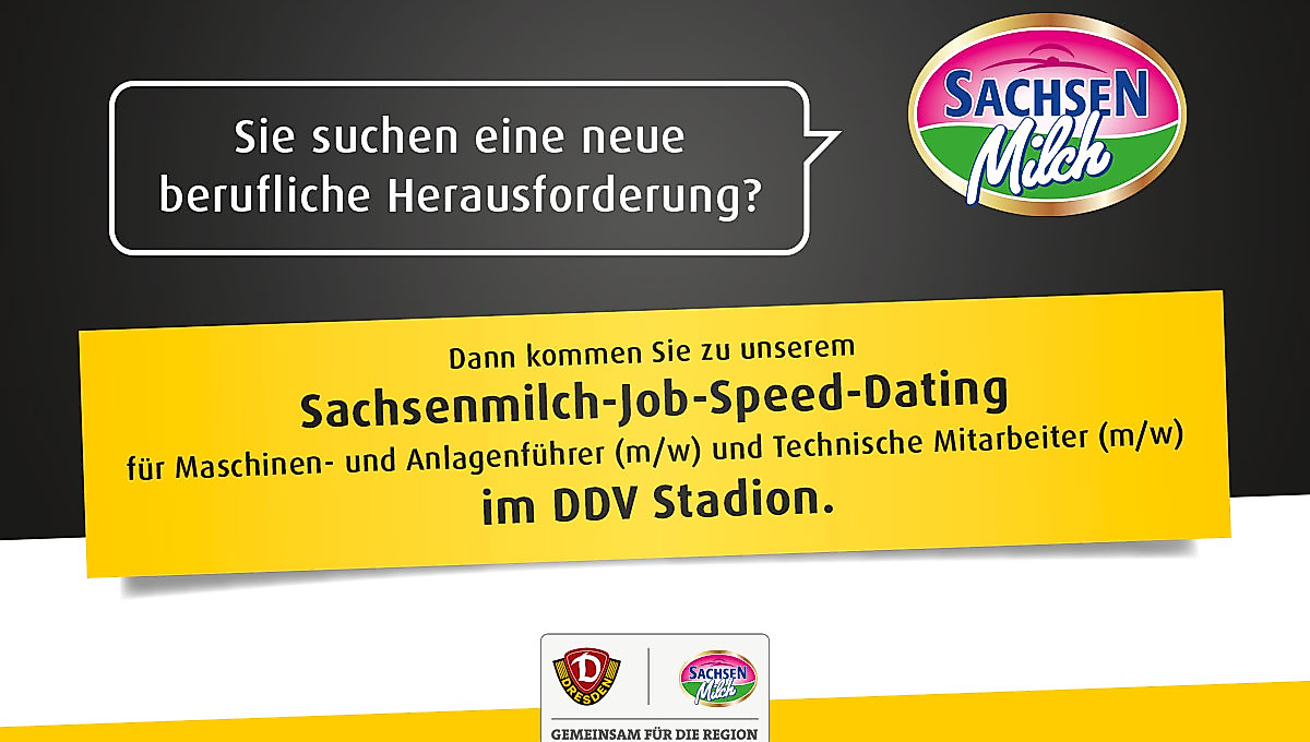 Suchen Sie eine neue berufliche Herausforderung? Dann kommen Sie zu unserem Sachsenmilch-Job-Speed-Dating am 27.01.2018 ins DDV-Stadion.Mit Unterstützung der SG Dynamo Dresden suchen wir für unseren Standort in Leppersdorf motivierte und engagierte Mitarbeiter im rollenden Schichtsystem. Interessieren Sie sich für eine Tätigkeit als Maschinen- & Anlagenführer (m/w) oder Technischer Mitarbeiter (m/w)?