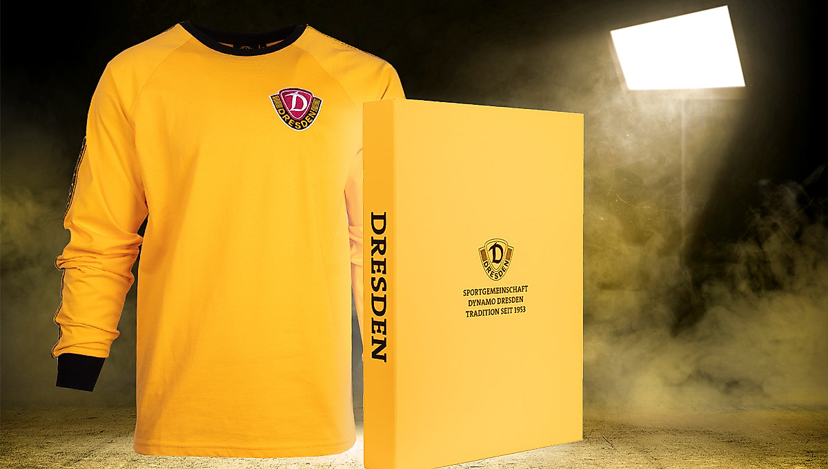 Darin befindet sich unter anderem ein modisches Langarm-Retroshirt mit vielen Details im klassischen schwarz-gelben Dynamo-Look, der an die Spielkleidung der Sportgemeinschaft zwischen 1980 und 1984 angelehnt ist.