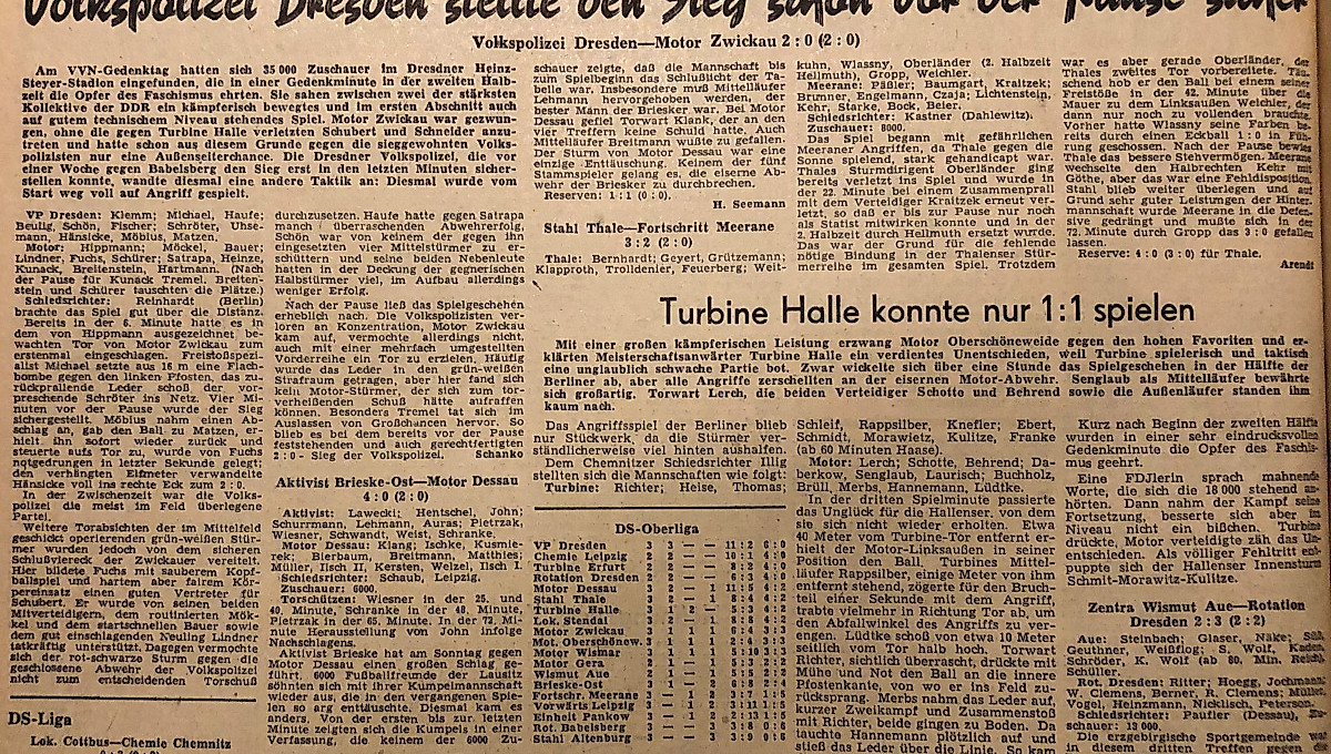 Die erste Tabellenführung verzeichneten die Dresdner übrigens am 09.09.1951, dem 3.Spieltag der Saison 1951/52, nach einem 2:0-Sieg gegen Zwickau - noch als SV Deutsche VP Dresden. Am Ende reichte es schließlich zur Vize-Meisterschaft.