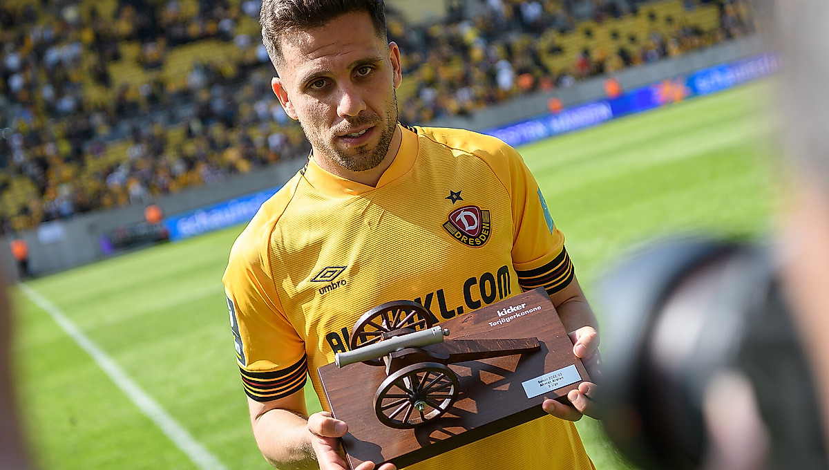 In 36 Partien stand die Leihgabe von Holstein Kiel in dieser Saison für Dynamo auf dem Platz. Bei 19 Begegnungen davon traf er, insgesamt ganze 25-mal und hat so den Rekord von Justin Eilers in der Saison 2015/2016 eingestellt. Damit hat er einen Toreschnitt von 0,76 Treffern pro Spiel. Nun wurde er nach der Partie gegen Oldenburg vom Fußballfachmagazin Kicker mit der Torjägerkanone gewürdigt.