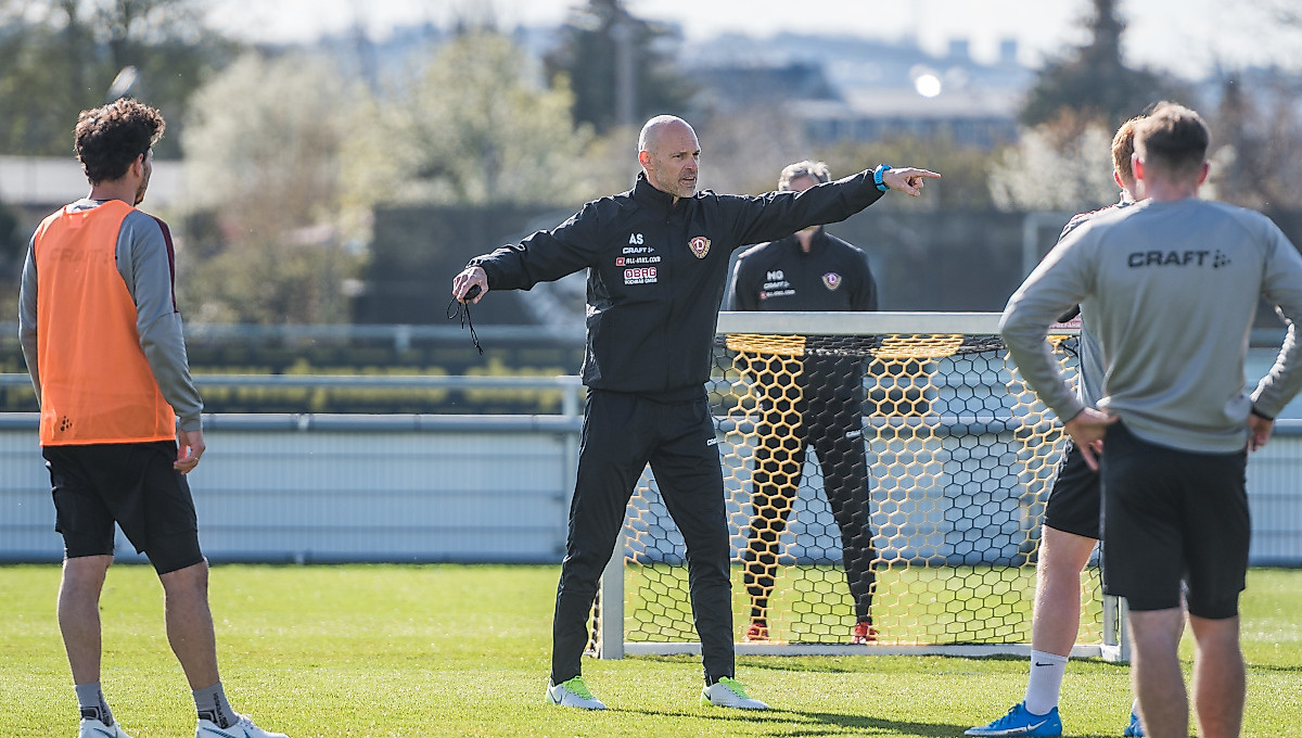 Am Montagnachmittag leitete Dynamos neuer Cheftrainer Alexander Schmidt bei herrlichem Sonnenschein seine erste Einheit in der AOK PLUS Walter-Fritzsch-Akademie. Der 52-Jährige hat insgesamt zweieinhalb Tage Zeit, um Dynamos Drittliga-Profis auf das nächste Heimspiel am Mittwoch, um 19 Uhr, gegen den MSV Duisburg vorzubereiten.Schmidt stellte sich um 16 Uhr im Mannschaftstrakt des Trainingszentrums seinen Spielern mit einigen persönlichen Worten vor und ging dann schnell zum nächsten Tagesordnungspunkt über, um dem Team bei einer Videobesprechung seine Vorstellung vom Fußball detailliert näherzubringen.