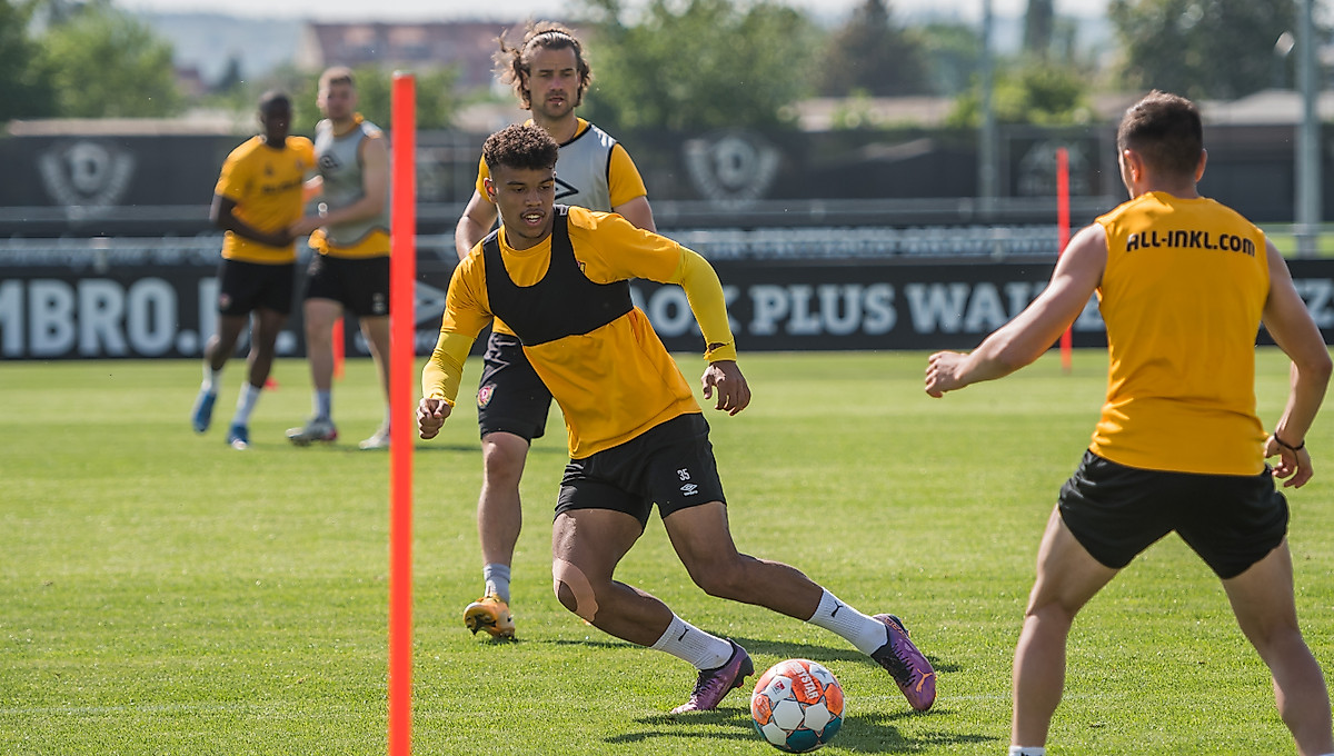 Vor etwa 70 Fans in der AOK PLUS Walter-Fritzsch-Akademie standen das Spiel mit dem Ball und der letzte athletische Feinschliff auf dem Trainingsplan. Nach einer Erwärmung unter Leitung von Konditions- und Fitnesstrainer Matthias Grahé wurde in Rondos mit Spielverlagerung an Passtempo und dem schnellen Spiel durch das Zentrum gearbeitet.