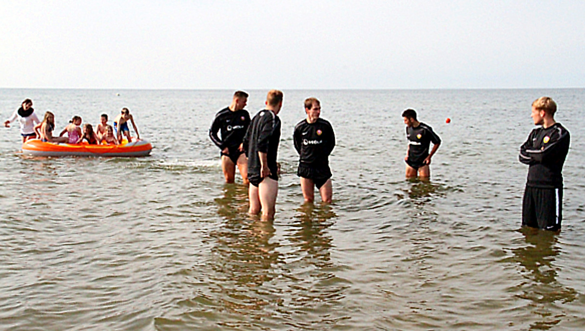 {media-left}Die ersten beiden Einheiten mussten auch am dritten Tag des Lauftrainingslagers noch ganz normal nach Plan von den Zweitliga-Profis absolviert werden. Zur letzten Übungseinheit des Tages ging es dann aber nur auf eine verkürzte Runde in den Wald. Nach etwa 30 Minuten lockerem Lauf bogen die Dynamos in kurzen Hosen, gutgelaunt und barfuß zum Strand ein. Dort erwarteten Ralf Loose und Co-Trainer Nico Däbritz auf zwei präparierten Feldern bereits die Mannschat zum teaminternen Volleyballturnier. „Wir haben uns alle riesig auf Beachvolleyball gefreut, das war eine gelungene Ablenkung vom harten Vorbereitungsalltag, die Spaß gemacht hat“, kommentierte Robert Koch lächelnd die willkommene Trainingsabwechslung. „Wenn man die ganze Zeit nur durch den Wald läuft und im Fitnessraum verbringt, tut es einfach gut, sich im Trainingslager auch mal mit einer anderen Sportart beschäftigen zu dürfen. Das lockert nicht nur unsere Muskulatur wieder etwas auf“, drückte Filip Trojan seine Freude über die spaßfördernde Volleyballpartie aus.