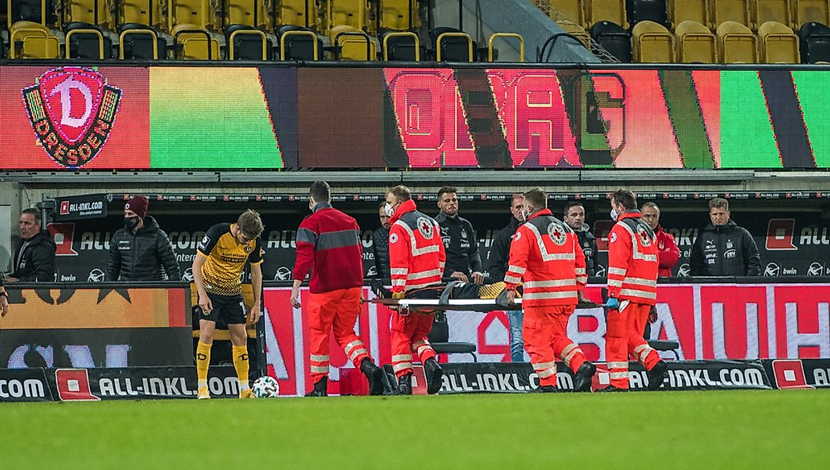 Chris Löwe musste direkt nach dem Zweikampf an der Mittellinie verletzungsbedingt ausgewechselt werden und wurde zur eingehenden Untersuchung anschließend ins Dresdner Universitätsklinikum gebracht.