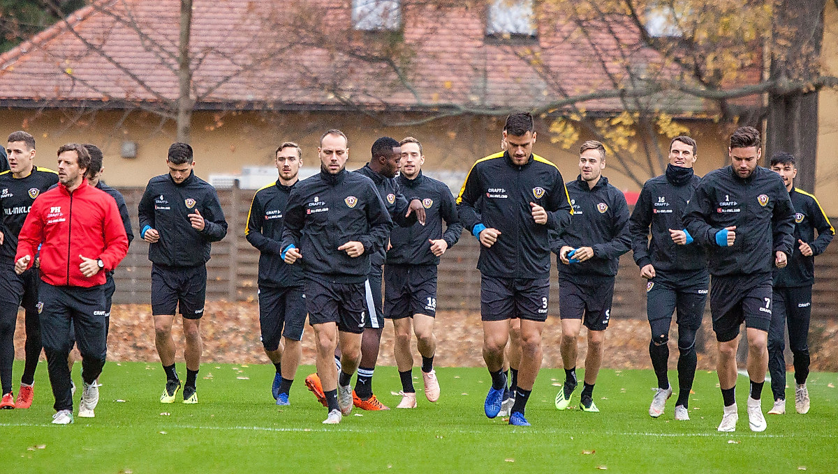 Unter den Augen von Dynamos Sportgeschäftsführer Ralf Minge und Aufsichtsrat „Dixie“ Dörner wurden eine Überzahlspielform auf engem Raum und andere Varianten mit Ball durchgeführt.
