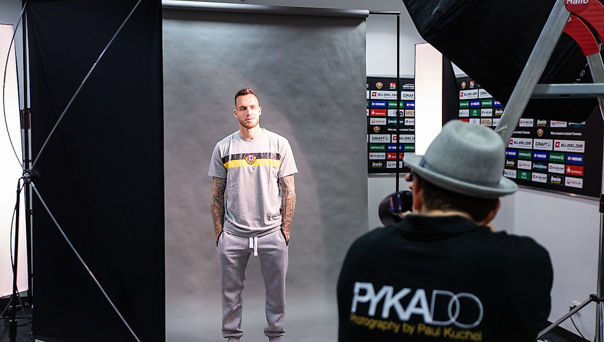 Im Zuge des offiziellen DFL-Fotoshootings der Winterneuzugänge der Sportgemeinschaft nutzte der Dynamo-Fanshop die Gunst der Stunde, um die sechs neuen Jungs der SGD mit allerlei schwarz-gelben Fanutensilien abzulichten.