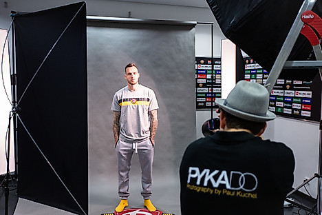 Vor der Linse von Fotograf Paul Kuchel von Pykado warfen sich Marco Terrazzino, Simon Makienok, Godsway Donyoh, Josef Husbauer, Ondrej Petrák sowie Patrick Schmidt voll ins Zeug und präsentierten munter Schals, Mützen, T-Shirts und Pullover aus dem dynamischen Fanshop-Sortiment.