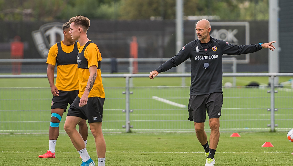 Dynamos Torhüter Kevin Broll, Anton Mitryushkin und Erik Herrmann absolvierten unterdessen auf dem Nebenplatz eine positionsspezifische Einheit mit Torwarttrainer David Yelldell.