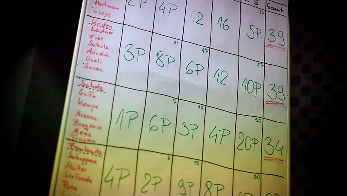 {media-left}Doch nachdem der komplizierte Punkte-Schlüssel Anwendung gefunden hatte, stockte den Spielern zweier Teams der Atem. Sowohl „Team Pellatz“ als auch „Team Kirsten“ standen bei 39 Zählern. Die Entscheidung musste am Würfeltisch fallen. Es kam zum Showdown zwischen Robert Koch, der den zu Vikotoria Köln abgewanderten Kapitän Nico Pellatz vertrat, und Benjamin Kirsten. Benny würfelte eine Sechs und entschied das Glücksspiel für "Team Kirsten".