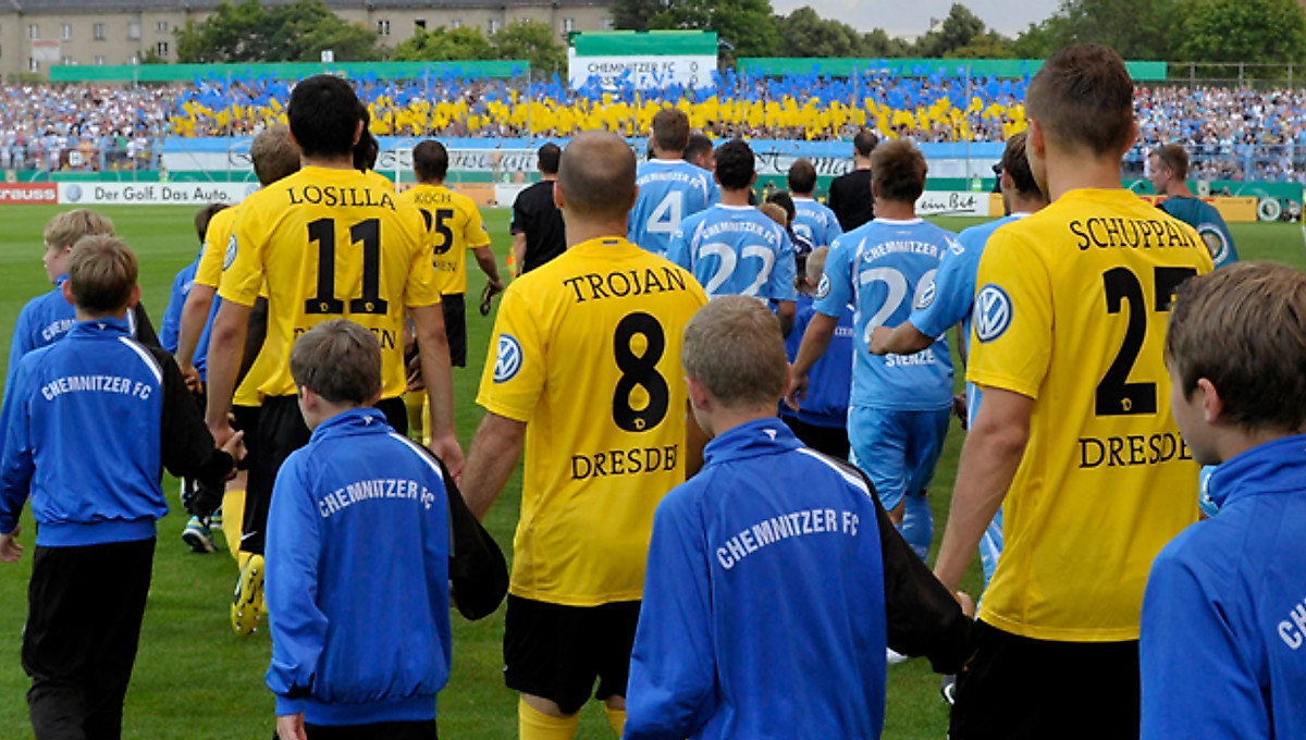 Dynamo-Trainer Ralf Loose überraschte sein Gegenüber Gerd Schädlich mit einer personellen Umstellung im defensiven Mittelfeld. Statt Giannis Papadopoulos durfte sich Florian Jungwirth beweisen, der Abwehrspieler rückte für den Griechen in die Startelf. Filip Trojan durfte wie im Spiel gegen München im zentralen Mittelfeld die Fäden ziehen und Mickael Poté sollte trotz Handverletzung als einzige Sturmspitze für schwarz-gelbe Gefahr vor dem Chemnitzer Tor sorgen. Die Anfangsminuten gehörten den Gastgebern, die sofort versuchten, ihren Gegner unter Druck zu setzen. Mit hoher Laufbereitschaft und einer kämpferischen Einstellung brachten die Himmelblauen ihre Gäste zunächst auch in Bedrängnis, ohne sich Chancen herauszuspielen. Von einem Klassenunterschied war zu diesem Zeitpunkt nichts zu sehen. Den Dresdnern fehlte noch ein wenig die Spritzigkeit, die Gastgeber spielten frech auf und ließen deutlich werden, dem Zweitligisten heute ein Bein stellen zu wollem.