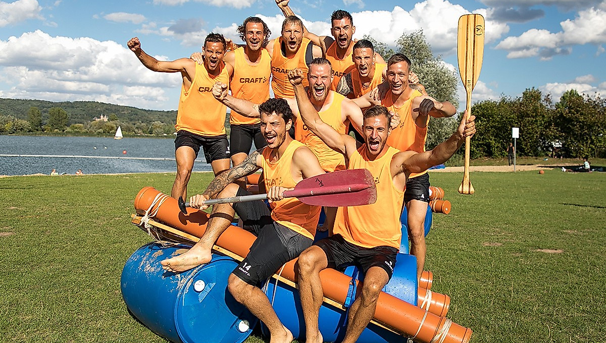In vier große Gruppen unterteilt mussten die Spieler sowie der Betreuerstab gemeinsam Flöße bauen, die das jeweilige Team am Ende sicher über das Wasser des Werratalsees bugsieren sollten. Dazu standen den Gruppen die unterschiedlichsten Materialien von Fässern bis zu Brettern zur Verfügung.