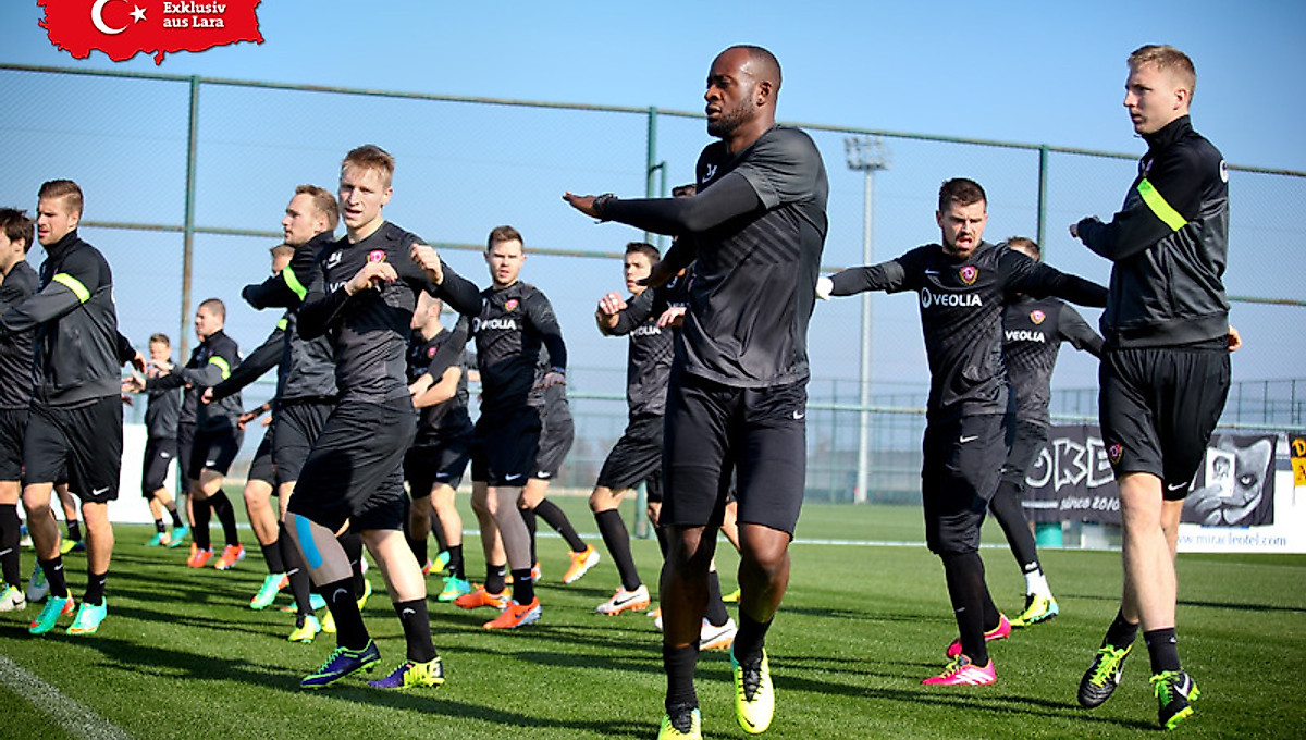 Bereits am ersten Arbeitstag im Trainingslager in der Türkei floss sehr viel Schweiß bei den Dynamo-Profis. Cheftrainer Olaf Janßen und sein Trainerteam fordern von ihren Schützlingen in Lara vom ersten Moment an volle Konzentration und höchsten Einsatz.Auch die Rahmenbedingungen sind optimal, nicht nur wegen des perfekten Wetters und angenehmen Temperaturen bis zu 17 Grad Celsius: „Der Rasen auf dem Trainingsplatz ist in einem sehr, sehr guten Zustand und das Wetter lässt gleich am ersten Tag keine Wünsche offen. Genauso erhofft man sich als Fußballprofi die Bedingungen im Trainingslager. Wir können uns hier voll auf unsere Arbeit konzentrieren, was sehr wichtig ist“, fasste Thorsten Schulz seine ersten Eindrücke vom Vorbereitungscamp zusammen. Dynamos Außenverteidiger absolviert sein erstes Türkei-Trainingslager mit der SGD.