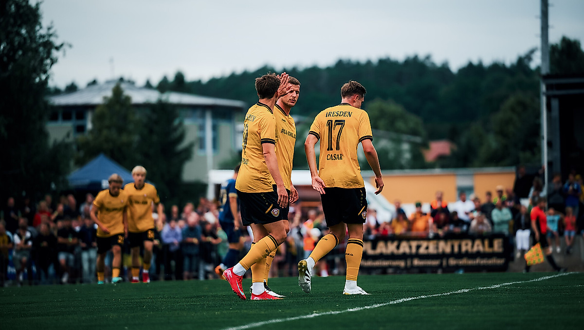 Dynamo begann druckvoll und übernahm schnell die Spielkontrolle. Nur ein Treffer blieb Schwarz-Gelb zunächst verwehrt. In der 13. Minute wurde dann Jonas Oehmichen per Heber im Strafraum bedient und legte den Ball gekonnt per Chip quer auf Aljaz Casar, der am langen Pfosten sicher einnetzte.