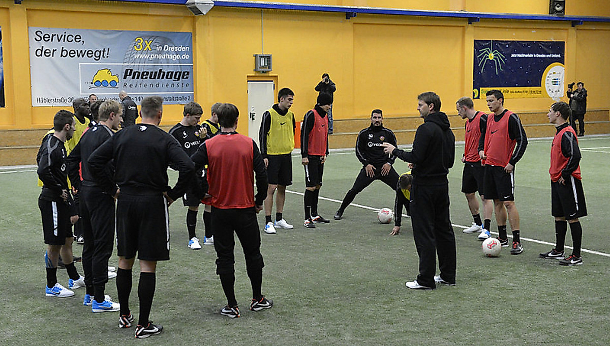 Nach der Beurlaubung von Ralf Loose leitete erstmals Dynamos Sportlicher Leiter Steffen Menze als Interimstrainer am Dienstag eine Übungseinheit mit den Zweitliga-Profis der SGD. Die Trainingseinheit musste aufgrund des extremen Wintereinbruchs in Dresden in die Halle verlegt werden. So trafen sich die Zweitliga-Kicker um 14:30 Uhr mit Hallenschuhen in Niedersedlitz in der Sachsenwerk Arena. Mit dabei war auch Dynamos Nachwuchstalent Marvin Stefaniak aus der U19. „Der Junge hat ein gewisses Potential, ich habe ihn schon etwas länger in unserer U19 beobachtet und wollte jetzt die Chance nutzen, um ihn mir mal im Training bei den Profis anzuschauen. Marvin wird definitiv bis zur Abreise nach München bei uns im Training bleiben“, erklärte Steffen Menze nach der ersten Trainingseinheit des 17-Jährigen mit Dynamos Profis in der „Soccerarena“.