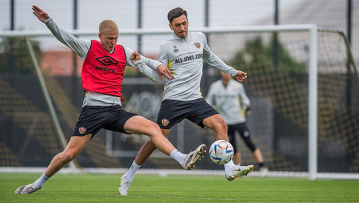 Pünktlich um 15 Uhr fanden sich die SGD-Profis, darunter auch Neuzugang Jakob Lewald, auf Platz eins des Trainingsgeländes ein und absolvierten zunächst eine Erwärmung mit Athletik- und Koordinationstrainer Matthias Grahé, der neben dem klassischen Programm heute außerdem verstärkt auf koordinative Übungen setzte.