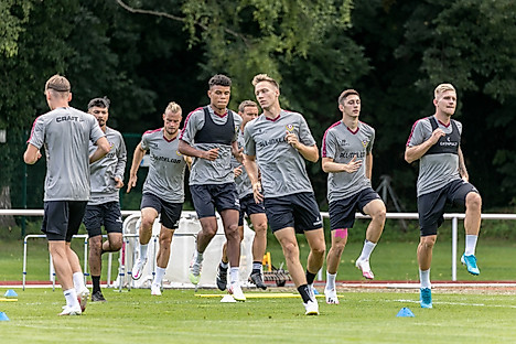 Im Anschluss ging es raus auf den Trainingsplatz, die alltägliche und bei manchem Profi gefürchtete Stabi-Einheit mit Physiotherapeut und Fitnesstrainer Tobias Lange fand direkt auf dem Rasen statt. Nach 20 Minuten hieß es kurz durchschnaufen und die Wasserspeicher wieder auffüllen, bevor Uwe Neuhaus zu einer 90-minütigen Trainingseinheit bat.