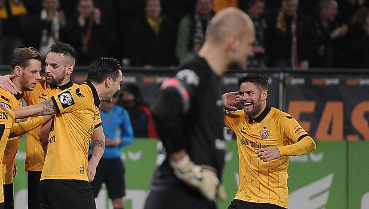 Wer jetzt jedoch glaubte, dass die beste Offensive der Liga schnell nachlegen könnte, sah sich getäuscht. Stattdessen waren es die Gäste, die zur Freude ihrer reichlich 200 mitgereisten Fans weiter am Ergebnis schraubten. Nachdem sich die Dresdner Hintermannschaft nicht klar befreien konnte, probierte sich Karsanidis volley aus gut 25 Metern – und fabrizierte einen Sonntagsschuss, wie er im Lehrbuch steht. Blaswich, der den Ball zu spät kommen sah, streckte sich noch, konnte die Kugel jedoch nicht mehr übers Tor lenken. Das Spielgerät schlug zum 1:1 im rechten Angel ein, alles stand wieder auf null (37.).