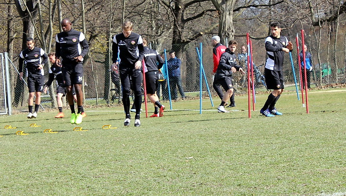 Der Tag begann mit einer Mannschaftsbesprechung und daran anschließend einem 25-minütigen Kraft- und Stabilisationstraining im Stadion. Danach begaben sich die Profis auf den Trainingsplatz im Großen Garten. Bei frühlingshaften Temperaturen und Sonnenschein standen nach der Erwärmung Sprung- und Koordinationsübungen auf dem Plan. Im Anschluss wurde an der Schnellkraft gearbeitet und ein Sprinttraining absolviert.