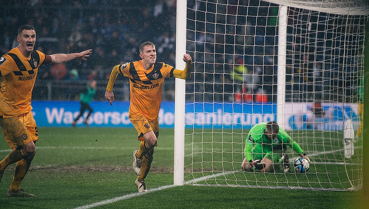 Aber auch die SGD hatte die Chance zur Führung: Hauptmann machte es aber zu genau und schob die Kugel knapp am rechten Pfosten vorbei (67.). Knapp zehn Minuten später machte es Dynamos Nummer 27 aber besser – viel besser! Nach einer Flanke von Lemmer stand Hauptmann goldrichtig und köpfte zur wichtigen Führung für Schwarz-Gelb ein (78.).