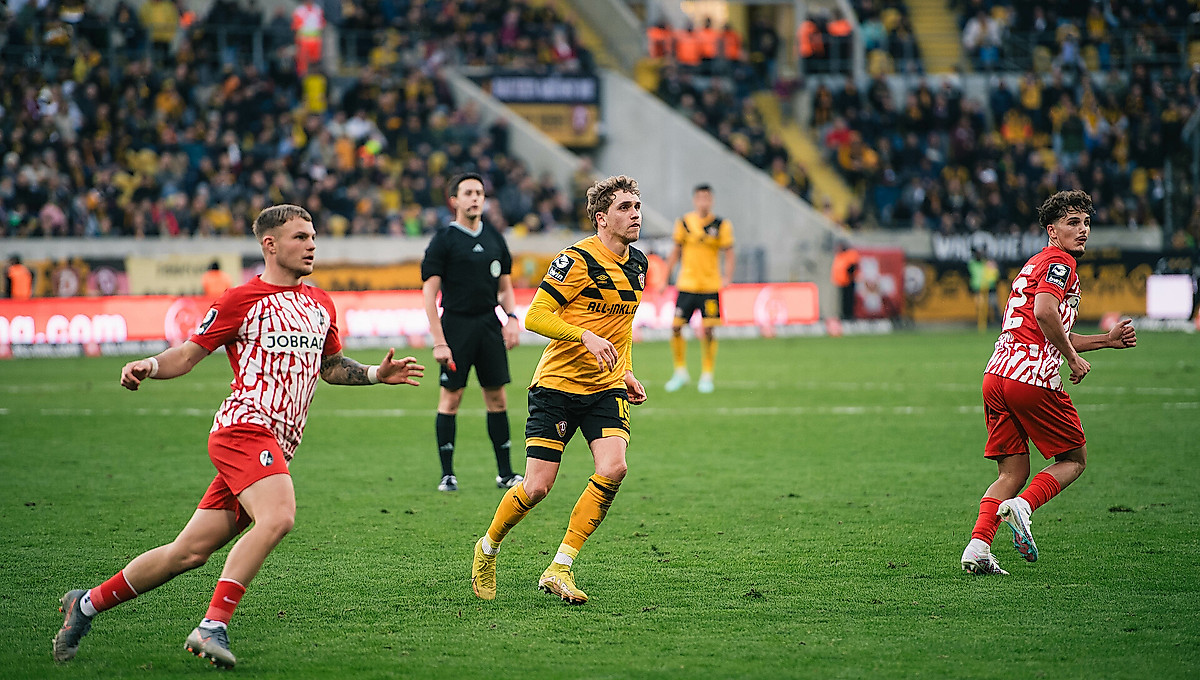 Dynamo erwischte einen Traumstart in die Begegnung. In der dritten Spielminute erkannte Luca Herrmann, dass Benjamin Uphoff im Freiburger Kasten weit vor seinem Tor war und zog von der Mittellinie ab. Freiburgs Hüter, dem die Sonne tief ins Gesicht stand, konnte nur noch hinterherschauen, wie der Ball im Netz einschlug und der Dresdner Hexenkessel das erste Mal explodierte. Ein Treffer aus der Kategorie: Tor des Jahres und zugleich das erste Pflichtspieltor für Herrmann überhaupt im schwarz-gelben „Nikki“.
