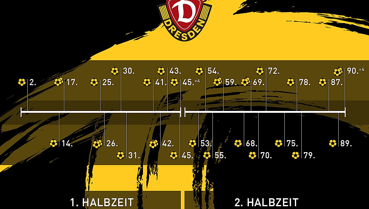 In den ersten 17 Meisterschaftsspielen der 3. Liga gelang es der Sportgemeinschaft bis dato insgesamt 30 Mal, den Ball im gegnerischen Kasten unterzubringen. Damit stellt die SGD die drittbeste Offensive der Liga. Lediglich die Fans des TSV 1860 München und des SV Wehen Wiesbaden konnten mit 37 beziehungsweise 31 erzielten Toren seit dem Saisonstart öfter jubeln.Dabei hatten die zehn verschiedenen schwarz-gelben Torschützen in den bisherigen Partien keinen Lieblingszeitpunkt für einen Dynamo-Treffer: 14 Mal schlugen die Schützlinge von Cheftrainer Markus Kauczinski in den ersten 45 Minuten zu, 16 Mal zappelte ein Abschluss eines SGD-Spielers in der zweiten Hälfte im Netz.