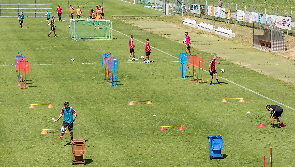 Die Mannschaft von Cheftrainer Cristian Fiel arbeitet im Sommertrainingslager in Österreich für alle Trainingsbeobachter sichtbar weiter mit Entschlossenheit auf dem Übungsplatz. Am Samstag standen in Vorbereitung auf die neue Zweitliga-Saison wieder zwei Einheiten auf dem Plan der Dynamo-Profis.In ein Vorbereitungscamp werden von Fußball-Mannschaften traditionell sehr viele Trainingsmaterialien mitgenommen. Dynamos Trainerteam greift auf die Hütchen, Stangen, Hürden und Mini-Tore in der tagtäglichen Arbeit mit Freude zurück.