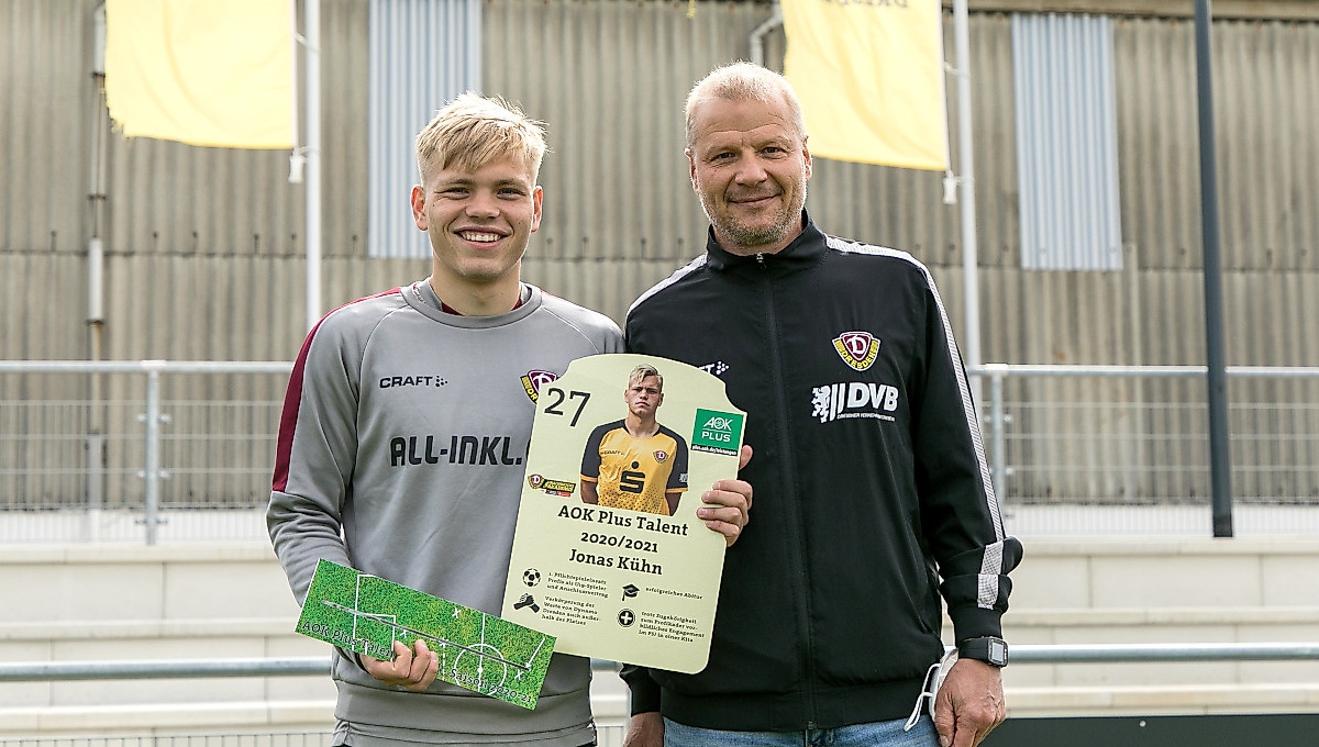 SGD-Youngster Jonas Kühn wurde am vergangenen Freitag am Rande des Abschlusstrainings vor dem letzten Drittliga-Saisonspiel der SGD in Wiesbaden als „AOK PLUS Talent 2020/21“ ausgezeichnet. Eine vereinsinterne Jury wählte den 19-Jährigen zu Dynamos Jugendspieler des Jahres.„Ich fühle mich geehrt und freue mich riesig über die Auszeichnung. Die vergangenen Monate waren sehr aufregend für mich und ich bin froh, dass ich meine ersten Schritte im Profibereich in so einer tollen Mannschaft machen konnte und weiterhin kann. Daran möchte ich in der nächsten Saison anknüpfen, mich weiterentwickeln und hart an mir arbeiten“, erklärte Jonas Kühn im Anschluss an die Preisübergabe, bei der das gesamte Profiteam der SGD Spalier stand und applaudierte.
