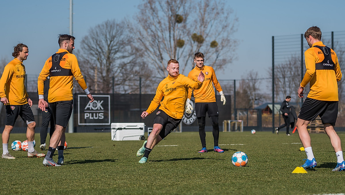 Die Zweitliga-Mannschaft der SG Dynamo Dresden ist am Montagnachmittag mit einer öffentlichen Einheit in der AOK PLUS Walter-Fritzsch-Akademie in die Trainingswoche gestartet, an deren Ende das Heimspiel gegen Jahn Regensburg am Samstag ansteht.Vor etwa 50 Kiebitzen leitete Konditions- und Athletiktrainer Matthias Grahé die Erwärmung, ehe erst in kleinen Ecken und dann in einem Überzahlspiel auf größerem Feld an Ballzirkulation und Passqualität gefeilt wurde.