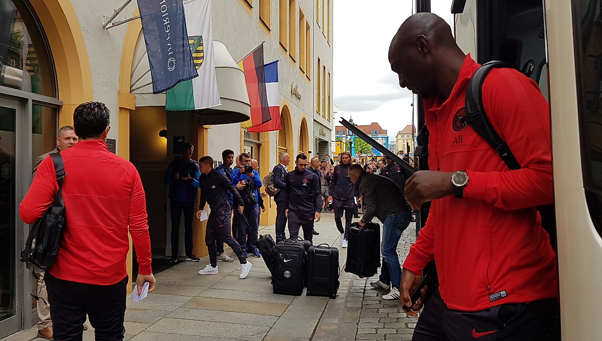 Das Starensemble um Kylian Mbappé, Marco Verratti und die deutschen Nationalspieler Julian Draxler, Thilo Kehrer und Kevin Trapp landete um kurz vor 12 Uhr am Dresdner Flughafen und fuhr anschließend in einem neutralen Bus zu besagtem Luxushotel in der Altstadt.