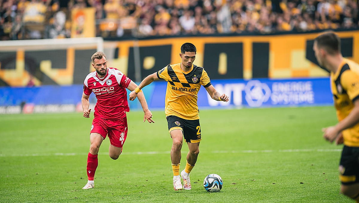 Wenig später wurde es laut im mit 29.589 Zuschauerinnen und Zuschauern gefüllten Rudolf-Harbig-Stadion. Dynamo eroberte den Ball und konterte über die rechte Seite mit Borkowski. Der ging bis zur Grundlinie und legte den Ball in die Mitte, wo der Bielefelder Semi Belkahia den Ball ins eigene Tor zur schwarz-gelben Führung abfälschte (14.).