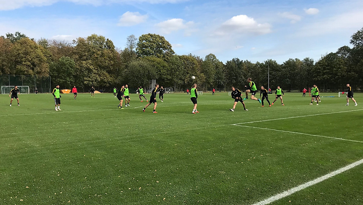 Am Donnerstag ging es nach einer rund 25-minütigen Erwärmung in den Stadionkatakomben um 13.10 Uhr hinaus auf den Trainingsplatz im Großen Garten. Die Trainingseinheit bei mildem Herbstwetter dauerte ca. 70 Minuten.